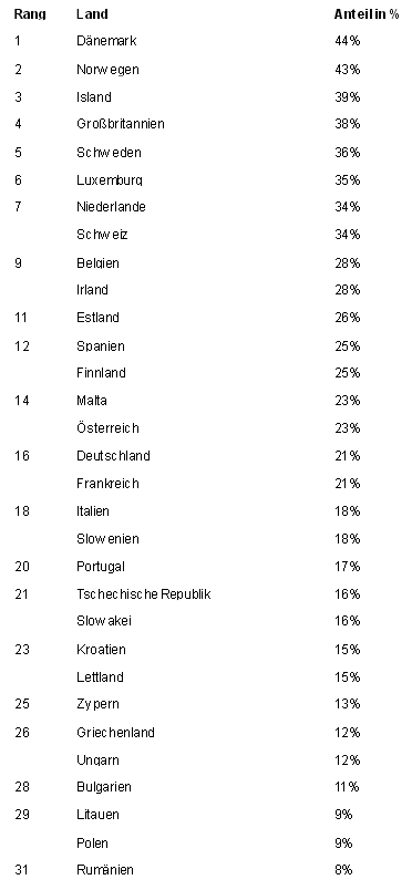 Hinweis zur Methodik: Grundlage für die Angaben ist eine Auswertung von Daten der europäischen Statistikbehörde Eurostat. Für den Vergleich wurden Einwohner zwischen 16 und 74 Jahren in 31 europäischen Staaten repräsentativ befragt.