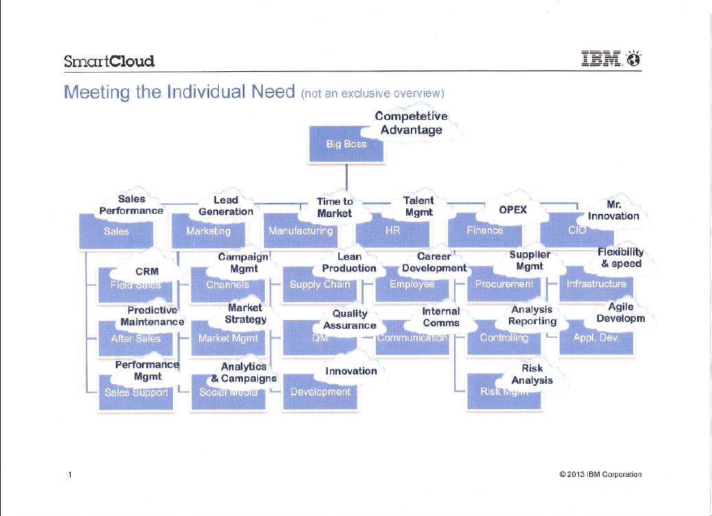 (01.08.13) - IBM gehört nach unabhängigen Marktanalysen und Umfragen zu den größten und weltweit führenden Anbietern im Cloud Computing-Markt. Das Angebotsspektrum reicht von der Analyse bestehender IT-Umgebungen über die Entwicklung unternehmensweiter Cloud-Strategien bis hin zu Automationstechnologien und der Umsetzung unterschiedlicher IT-Betriebsmodelle. Susan Volkmann, Direktorin Cloud Computing Leader Deutschland bei IBM, weist darauf hin: "IBM hat das 'IBM SmartCloud'-Portfolio rein auf den B2B-Markt ausgerichtet und bietet keine Public-Cloud-Services für den Consumer Markt."